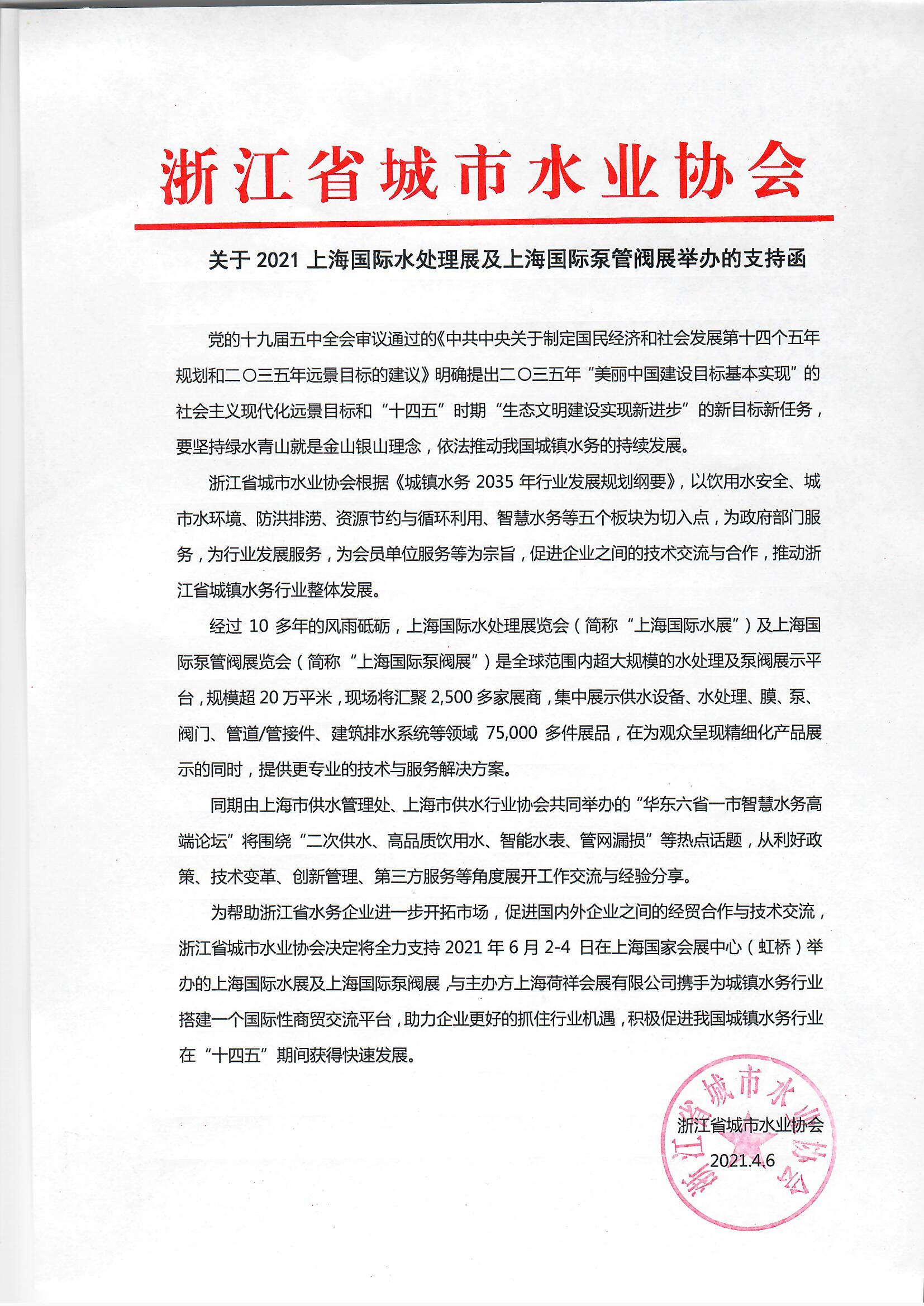 為幫助浙江省水務(wù)企業(yè)進一步開拓市場,促進國內(nèi)外企業(yè)之間的經(jīng)貿(mào)合作與技術(shù)交流,浙江省城市水業(yè)協(xié)會決定將全力支持 2021 年 6 月 2-4 日在上海國家會展中心(虹橋)舉辦的上海國際水展及上海國際泵閥展,與主辦方上海荷瑞展覽有限公司攜手為城鎮(zhèn)水務(wù)行業(yè)搭建一個國際性商貿(mào)交流平臺,助力企業(yè)更好的抓住行業(yè)機遇,積極促進我國城鎮(zhèn)水務(wù)行業(yè)在"十四五"期間獲得快速發(fā)展。