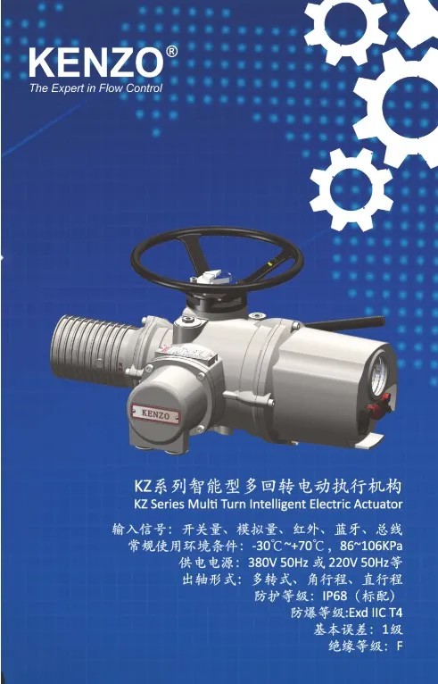 肯佐控制設(shè)備(上海)有限公司生產(chǎn)的新一代智能型kz系列電動執(zhí)行機(jī)構(gòu),可以通過一個獨(dú)立的設(shè)定器對其進(jìn)行非侵入性的快速設(shè)定、檢查及查詢。執(zhí)行機(jī)構(gòu)采用大屏液晶顯示器,以中文、數(shù)字、圖形等形式顯示執(zhí)行機(jī)構(gòu)的轉(zhuǎn)矩、閥門位置、限位設(shè)定等工作狀態(tài)和報(bào)警,極大地方便了用戶的操作使用。