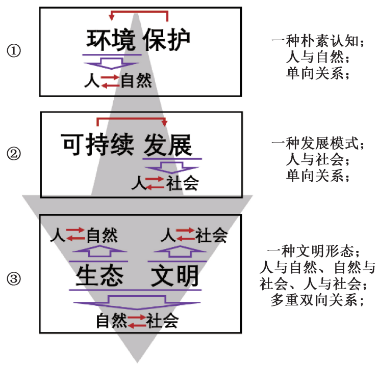 “生態(tài)文明”的概念,描述的則是一種歷史上未曾出現(xiàn)過(guò)的文明形態(tài)。它提出以“人與自然、自然與社會(huì)、人與社會(huì)和諧共生、良性循環(huán)、全面發(fā)展、持續(xù)繁榮”為基本宗旨的社會(huì)形態(tài)。它的內(nèi)涵包括而又超越之前的認(rèn)識(shí),“生態(tài)”兩字反映著人與自然的關(guān)系,保護(hù)自然同時(shí)享用自然;“文明”兩字反映著人與自然、社會(huì)之間的關(guān)系,人類要敬畏自然,個(gè)人服從社會(huì),同時(shí)社會(huì)支撐個(gè)人的發(fā)展;“生態(tài)”與“文明”銜接,反映著自然與社會(huì)之間的關(guān)系,自然以資源的方式為社會(huì)提供物質(zhì)基礎(chǔ),社會(huì)以科技的方式尊重自然?!吧鷳B(tài)文明”概念,蘊(yùn)含多重雙向關(guān)系,超越了狹義的“環(huán)境保護(hù)”以及“可持續(xù)發(fā)展”,在關(guān)注“人與自然”關(guān)系的傳統(tǒng)觀念基礎(chǔ)上,增加了對(duì)“自然與社會(huì)”和“人與社會(huì)”之間和諧關(guān)系的強(qiáng)調(diào),是對(duì)環(huán)境保護(hù)概念的一次創(chuàng)造性升級(jí)深化,為人類文明的走向提供了一種超越“工業(yè)文明”的新形態(tài),即,這是一種“生態(tài)”的“文明”,這種“文明”以文明的方式對(duì)待“生態(tài)”。