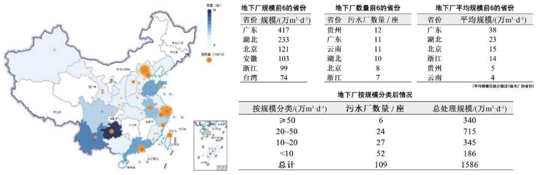 客觀上,我國(guó)地下污水處理廠建設(shè)呈現(xiàn)逐年增長(zhǎng)的趨勢(shì),發(fā)展十分迅速。據(jù)不完全統(tǒng)計(jì),截至2020年底,我國(guó)地下污水處理廠數(shù)量達(dá)到109座,總處理規(guī)模1 586萬(wàn)m3/d,其中半數(shù)地下廠規(guī)模超過(guò)10萬(wàn)m3/d,近半數(shù)污水由20萬(wàn)~50萬(wàn)m3/d區(qū)間規(guī)模的大型地下廠處理,為全世界地下廠數(shù)量最多的國(guó)家。具體來(lái)說(shuō),我國(guó)地下污水處理廠分布具有明顯的地區(qū)集中性特點(diǎn),主要分布于環(huán)渤海、長(zhǎng)三角和珠三角等經(jīng)濟(jì)發(fā)達(dá)地區(qū),以及地貌較復(fù)雜的云貴川區(qū)域。如圖3所示,以污水處理規(guī)模計(jì),地下廠規(guī)模最大的省份分別為廣東、湖北和北京,日處理規(guī)模均超過(guò)百萬(wàn)立方米,其中廣東省規(guī)模居首,達(dá)到417萬(wàn)m3/d。以數(shù)量計(jì),擁有最多地下廠數(shù)量的省份分別為貴州、廣東和云南,均達(dá)到10座以上。不同地域的地下污水處理廠,其污水處理規(guī)模具有顯著差異,云、貴兩省的地下廠規(guī)模相對(duì)較小,平均規(guī)模4萬(wàn)~5萬(wàn)m3/d;而北京、浙江的地下廠平均規(guī)模相對(duì)較大,達(dá)到14萬(wàn)~15萬(wàn)m3/d;而廣東、湖北地下廠平均規(guī)模較大,分別為23萬(wàn)m3/d、38萬(wàn)m3/d。地下污水處理廠已經(jīng)成為“十四五”期間市政污水處理行業(yè)的新增長(zhǎng)點(diǎn)。