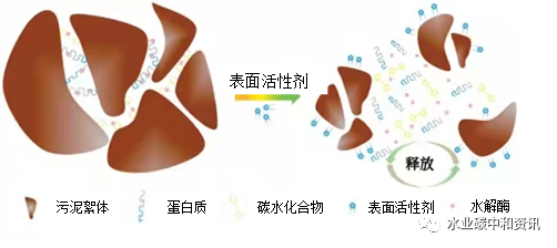 表面活性劑具有和聚丙烯酰胺類似功能,可以用作脫水助劑,能大幅度降低濾餅水分含量。具體來說,表面活性劑親水基團(tuán)會與蛋白質(zhì)結(jié)合,從而損害生物膜功能性和完整性;而疏水基團(tuán)與脂質(zhì)結(jié)合,可導(dǎo)致膜液化、損害其屏障特性。與此同時,表面活性劑攜帶的電荷效應(yīng)會在一定程度上中和污泥表面電荷,降低污泥之間靜電斥力,使污泥絮體變得松散;表面活性劑也會增加細(xì)胞疏水性,促進(jìn)細(xì)胞與細(xì)胞之間的相互作用,進(jìn)一步誘導(dǎo)污泥絮體從親水性液相中脫出,從而提高沉降速率和脫水性能。