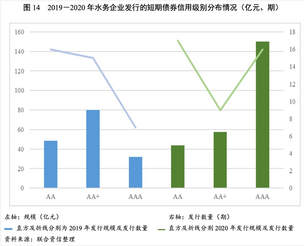 整體來(lái)看,水務(wù)企業(yè)選用短期債券進(jìn)行融資的頻率及規(guī)模有所增加,發(fā)行規(guī)模的增長(zhǎng)主要來(lái)自aaa主體所發(fā)的短期融資券及短期公司債。2020年全年累計(jì)使用短期債券融資較大的企業(yè)為水發(fā)集團(tuán)有限公司(65億元)和廣東粵??毓杉瘓F(tuán)有限公司(50億元)。