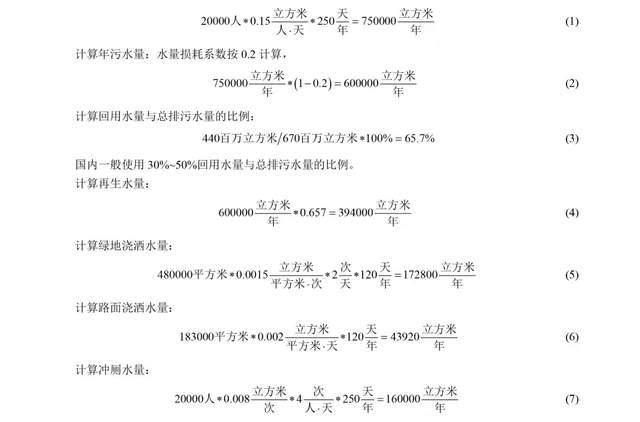3)西安思源學院不斷踐行低碳節(jié)能環(huán)保,堅持創(chuàng)新,并且在污水處理再生水回用取得很好的成效[13][14][15]。西安思源學院董事會在2000年學校從市區(qū)遷往白鹿塬時就站在保護環(huán)境、走可持續(xù)發(fā)展道路的高度,利用有限的自有資金,建設生活污水處理站。鋪設專用2m2范圍內的雨水,以及一座1800立方米的游泳池、3座600立方米的景觀噴水池定期換掉的剩水收集管網300多米,大小再生水水庫(包括3座景觀噴水池)5座,擁有各種型號水泵12臺,再生水專用管線25千米。投資一千三百萬完成日處理量為(2000+2000)立方米的mbr膜生物反應器的土建基礎設施,安裝了2000立方米/天的處理設備并于2011年9月順利投入運行。學校于2019年11月再次投資580萬元對污水處理廠原先預留的2000立方米膜處理設施進行設備安裝并投入使用。9年半里mbr膜生物反應器已經處理670萬立方米的污水,產出440萬立方米符合國家標準再生水并全部回用。西安思源學院現(xiàn)有2萬名師生。用再生水沖廁,澆灌48hm2綠化地,和澆酒18.3hm2路面。除了西安思源學院在污水處理再生水回用取得超出國內外許多專家、學者、制造商的預料外,還對所有資金使用、操作程序、運轉數(shù)據(jù)都有案可查??梢酝ㄟ^以下的計算,對單位里的污水量、再生水量、再生水回用量做個概算。