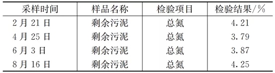 微生物在生長繁殖過程中,會攝取污水中一部分氮來合成自身細(xì)胞組分,采用《城鎮(zhèn)污水處理廠污泥檢驗方法》(cj/t 221-2005)第49章中的方法對剩余污泥中氮含量進(jìn)行檢測,檢測時間為2020年,檢測結(jié)果見表1。