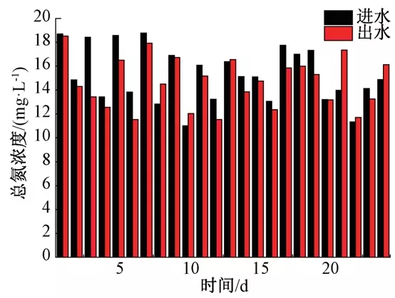 再生水廠以3.75萬m3/d規(guī)模生物池為研究對象,控制該生物池污泥濃度為6 500 mg/l、水溫23 ℃、混合液回流比為500%、生物池好氧區(qū)前、中、后段do分別為1.5 mg/l、1.2 mg/l以及0.5 mg/l。對好氧段進(jìn)出水的總氮濃度變化進(jìn)行檢測,結(jié)果如圖1所示。