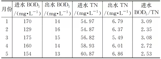 然而在實(shí)際運(yùn)行過程中,受回流液中do濃度的影響,反硝化效率很難達(dá)到理論值。如表2所示,再生水廠2021年1月至5月進(jìn)水bod5/tn的平均值為2.75,低于2.86的理論值。日常該水廠生物池內(nèi)回流比為350%左右,按照式(2)計算理想狀態(tài)下的脫氮效率為78%,在未投加外加碳源的情況下生物系統(tǒng)實(shí)際反硝化脫氮效率為77%(見表3)??紤]剩余污泥排放中攜帶的氮含量,進(jìn)水總氮平均去除率為89%。