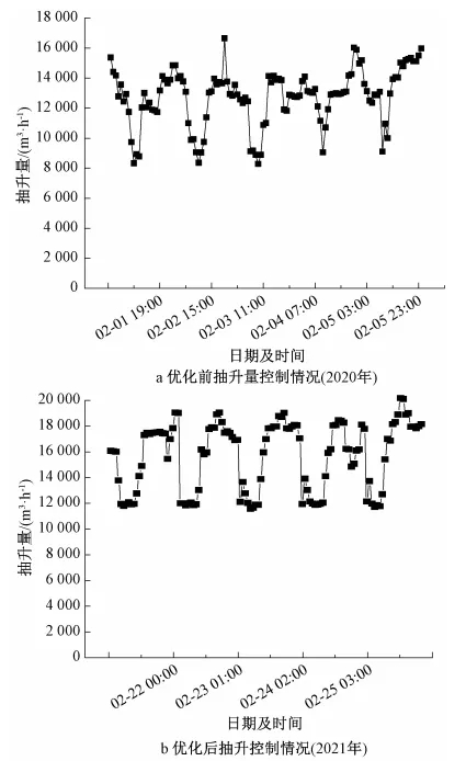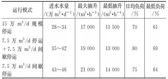 再生水廠結(jié)合來水時變化及日變化規(guī)律,通過生物池及膜池間歇停運(yùn)的方式(見表4),提高日水力負(fù)荷至70%以上。并充分利用上游污水管網(wǎng)調(diào)蓄功能,控制瞬時最低抽升量不低于運(yùn)行曝氣池負(fù)荷的60%(見圖3b)。