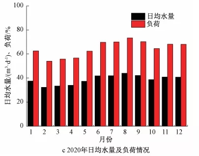 受城市生產(chǎn)活動的影響,污水處理廠在實(shí)際運(yùn)行過程中不同時段、季節(jié)來水水量呈規(guī)律性波動。水力負(fù)荷過低或水量時變化系數(shù)過大對回流液do濃度、內(nèi)回流比等脫氮重點(diǎn)指標(biāo)控制會帶來一定困難。以再生水廠2020年來水情況為例,水量峰谷差值比例超過50%(見圖3a),瞬時最低負(fù)荷僅為設(shè)計值的30%。不同月份水量差異也較為明顯,最低負(fù)荷僅為設(shè)計值的53%(見圖3c)。