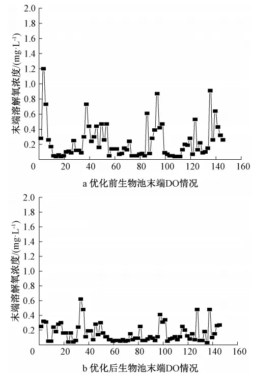 通過配水優(yōu)化、抽升控制、生物池倒運(yùn)等方式,穩(wěn)定生物池水力負(fù)荷。優(yōu)化后,生物池do穩(wěn)定性明顯提高(見圖6b),末端do濃度基本低于0.5 mg/l,滿足反硝化對于do濃度的要求,同時大大降低了回流液中的do對于進(jìn)水碳源的浪費(fèi)。