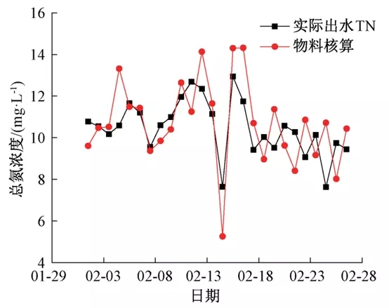 以再生水廠2020年2月份的實(shí)際出水tn與物料平衡方程模擬出水tn進(jìn)行對比,結(jié)果如圖7所示。