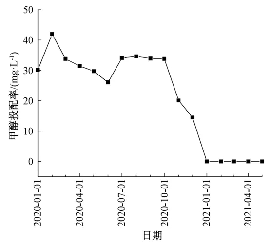 (4) 通過建立氮的物料平衡模型,對工藝運(yùn)行參數(shù)進(jìn)行過程控制,再生水廠甲醇投配率逐漸降低,于2021年實(shí)現(xiàn)了碳源零投加。