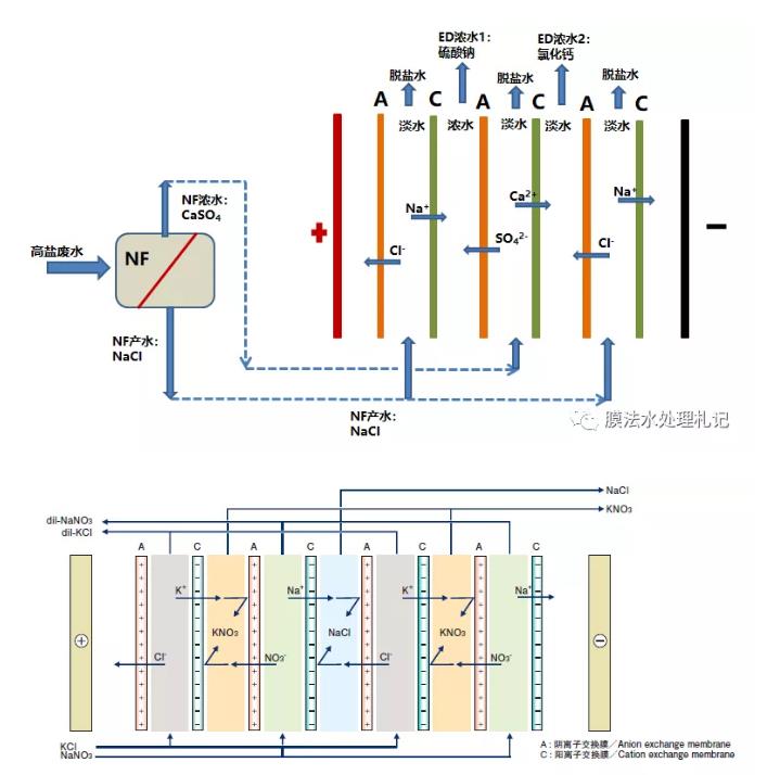 nf-ed的聯(lián)用工藝可以算一個(gè)思路,工藝可行性沒(méi)有問(wèn)題,它其實(shí)是置換電滲析(第二張圖)的延伸應(yīng)用。這種工藝在廢水處理需求中落地性會(huì)受限于多種因素,如廢水組成、濃水溶液的純度、脫鹽水的處理等。
