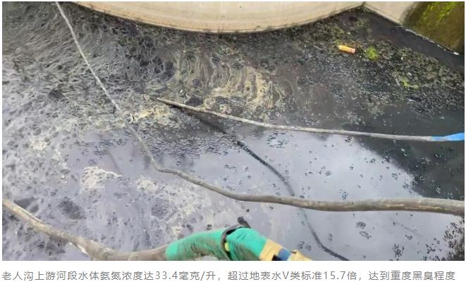 督察組前期暗訪(fǎng)發(fā)現(xiàn),老人溝沿江平路2公里長(zhǎng)的河段水體明顯發(fā)黑發(fā)臭,氨氮濃度最高為33.4毫克/升,超過(guò)地表水v類(lèi)標(biāo)準(zhǔn)的15.7倍,達(dá)到重度黑臭程度。進(jìn)一步排查發(fā)現(xiàn),河道沿線(xiàn)排污納管仍不徹底,存在7個(gè)生活污水直排口。其中,距入槐泗河口約200米處的一處污水井大量溢流,采樣監(jiān)測(cè)結(jié)果顯示,外排污水化學(xué)需氧量、氨氮濃度分別高達(dá)136毫克/升、46.0毫克/升;江陽(yáng)家園西側(cè)排口排水氨氮濃度達(dá)到34.0毫克/升。老人溝上游段新建的提升泵站污水溢流入河,外排污水化學(xué)需氧量、氨氮濃度分別達(dá)到82毫克/升、19.4毫克/升。