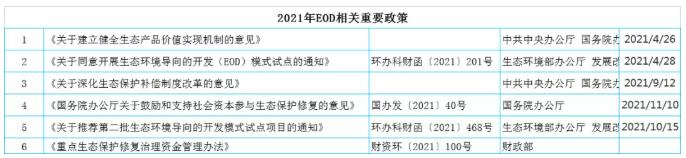 2021年,從政策層面的進一步明確到試點推進的不斷加深,eod模式落地加速。根據(jù)環(huán)境商會觀察,一是2021年全年,相關(guān)政策陸續(xù)發(fā)布,對eod的支持力度加大。