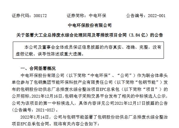 2022年1月14日,公司與包鋼節(jié)能簽署了包鋼股份動(dòng)供總廠總排廢水綜合整治項(xiàng)目epc總承包合同。合同總額約3.84億元(含稅)。