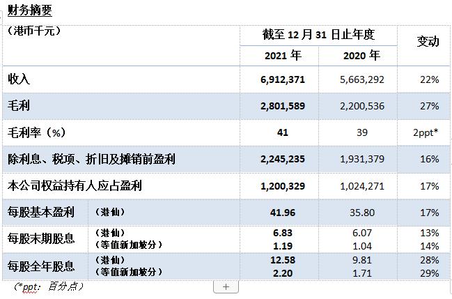 二零二一財政年度,本集團經營勢頭穩(wěn)健,錄得收入69.1億港元,較二零二零財政年度增長22%;除利息、稅項、折舊及攤銷前盈利22.5億港元,較二零二零財政年度增長16%;本公司權益持有人應占盈利12.0億港元,較二零二零財政年度增長17%;每股基本盈利41.96港仙,較二零二零財政年度增加6.16港仙,增幅17%;整體毛利率為41%,較二零二零財政年度上升2個百分點。本集團融資渠道多元暢通,融資工具長短期兼?zhèn)?,資產質優(yōu),資金充裕,負債合理,財務狀況健康。