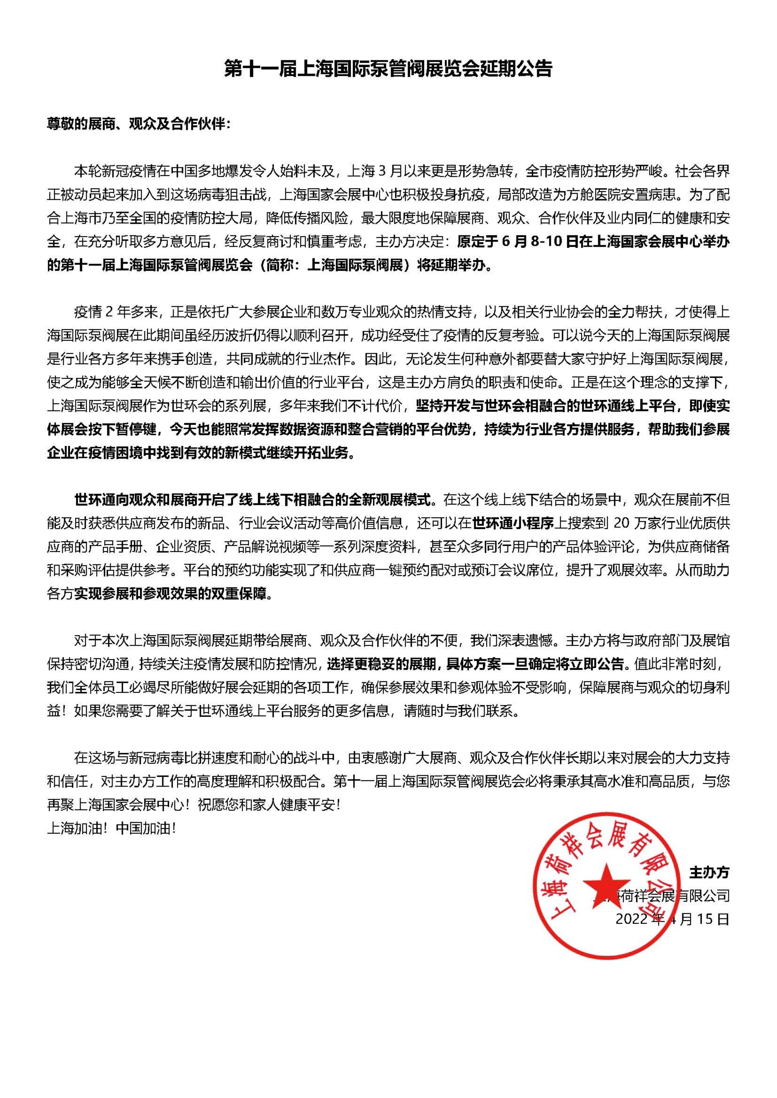 本輪新冠疫情在中國多地爆發(fā)令人始料未及,上海3月以來更是形勢急轉(zhuǎn),全市疫情防控形勢嚴峻。社會各界正被動員起來加入到這場病毒狙擊戰(zhàn),上海國家會展中心也積極投身抗疫,局部改造為方艙醫(yī)院安置病患。為了配合上海市乃至全國的疫情防控大局,降低傳播風(fēng)險,最大限度地保障展商、觀眾、合作伙伴及業(yè)內(nèi)同仁的健康和安全,在充分聽取多方意見后,經(jīng)反復(fù)商討和慎重考慮,主辦方?jīng)Q定:原定于6月8-10日在上海國家會展中心舉辦的第十一屆上海國際泵管閥展覽會(簡稱:上海國際泵閥展)將延期舉辦。